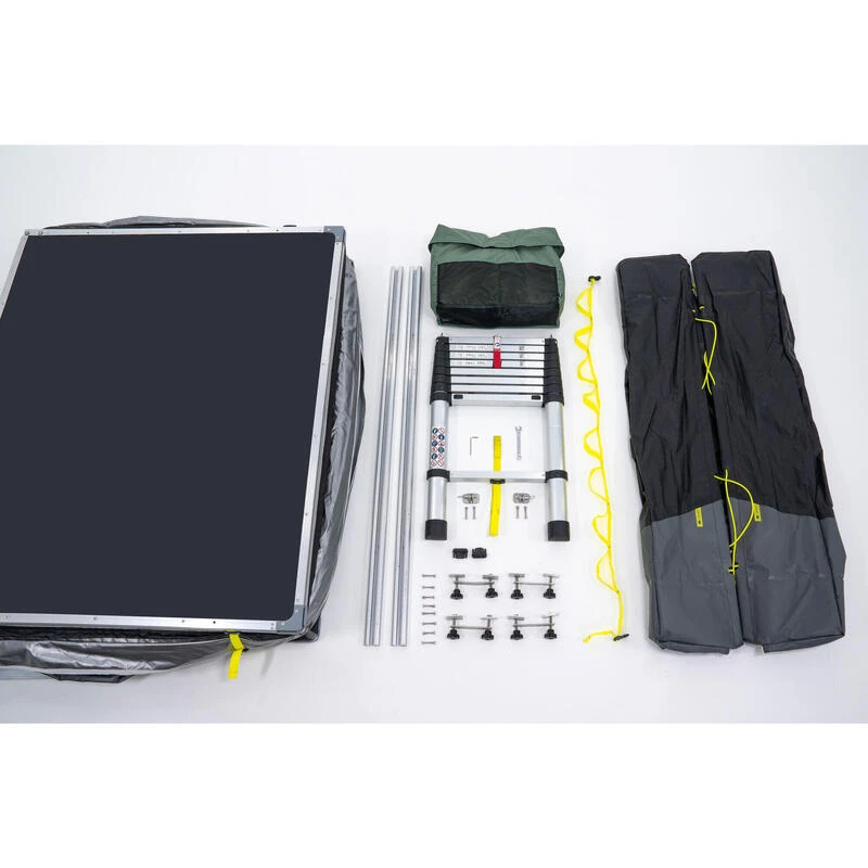 Ajustez l’échelle afin que la tente soit à plat, et sécurisez bien les barreaux, ils doivent impérativement être bloqués avant de pouvoir monter dessus.